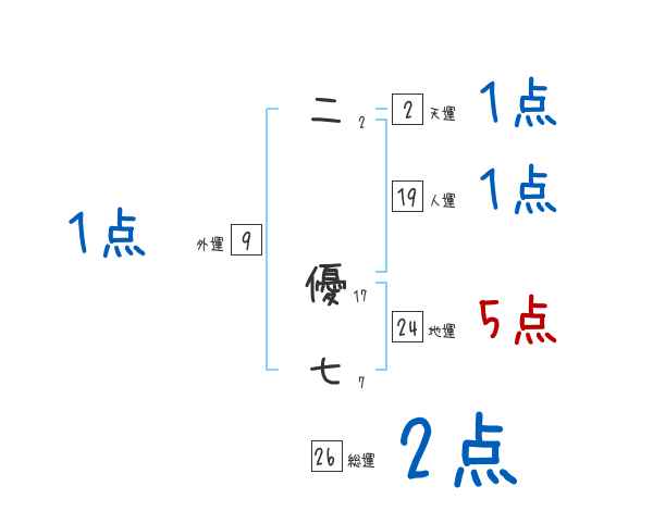 天運![]() | 二優七さんの天運は2画の1つ星!優しいですが積極性や意思の強さに欠ける傾向があります。家庭環境の乱れに注意しましょう。 家系が持つ宿命的な運勢を表します。祖先から受け継いだ苗字ですので自分の力が及びません。家柄を象徴します。 |