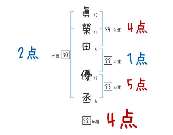 外運![]() | 眞榮田優丞さんの外運は30画の2つ星!浮き沈みの激しさに注意しましょう。 生活面を象徴する運勢です。外部から受ける影響力を表し、結婚運、家庭運や職場、環境への順応性を表します。 |