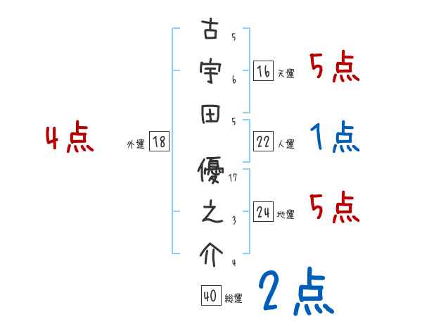 天運![]() | 古宇田優之介さんの天運は16画の5つ星!人望が厚く大きく発展する。逆転成功が見える。 家系が持つ宿命的な運勢を表します。祖先から受け継いだ苗字ですので自分の力が及びません。家柄を象徴します。 |