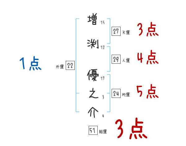 総運![]() | 増渕優之介さんの総運は51画の3つ星!変化が激しく、危険に注意。堅実な性格。 あなたの人生を表す1番重要な運勢です。生涯を通じて影響する総合運となり、主に50歳以降の晩年期に影響を及ぼします。 |