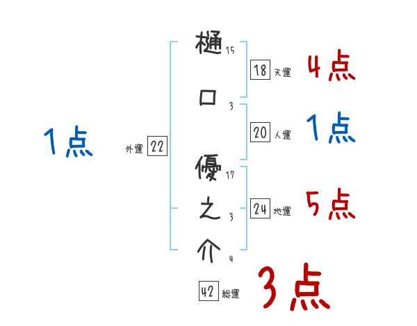 外運![]() | 樋口優之介さんの外運は22画の1つ星!努力することが苦手ないっぽう手先が器用。芸術性にも優れる。 生活面を象徴する運勢です。外部から受ける影響力を表し、結婚運、家庭運や職場、環境への順応性を表します。 |