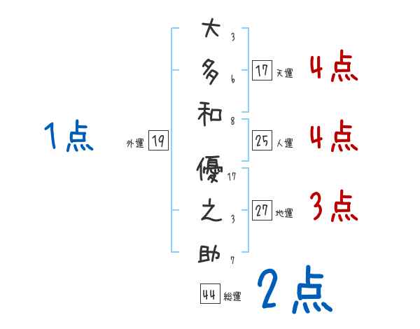 外運![]() | 大多和優之助さんの外運は19画の1つ星!優れた才能を持ちますが、協調性が足りないことも。周りの人と協力する事を意識しましょう。 生活面を象徴する運勢です。外部から受ける影響力を表し、結婚運、家庭運や職場、環境への順応性を表します。 |