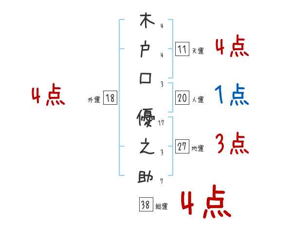 外運![]() | 木戸口優之助さんの外運は18画の4つ星!情熱的で剛気。忍耐力があり信頼される。 生活面を象徴する運勢です。外部から受ける影響力を表し、結婚運、家庭運や職場、環境への順応性を表します。 |