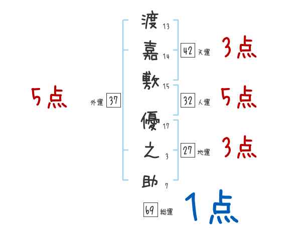 人運![]() | 渡嘉敷優之助さんの人運は32画の5つ星!柔軟性があり成功する。チャンスが多く金運が良い。 性格や才能などを表す2番目に重要な運勢です。人間関係や協調性、社会的な成功に影響します。主に20歳から50歳ぐらいまでの中年期の運勢を表します。 |