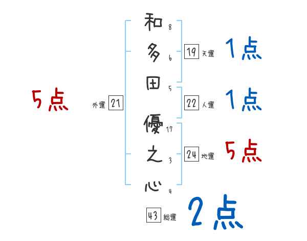 人運![]() | 和多田優之心さんの人運は22画の1つ星!努力することが苦手ないっぽう手先が器用。芸術性にも優れる。 性格や才能などを表す2番目に重要な運勢です。人間関係や協調性、社会的な成功に影響します。主に20歳から50歳ぐらいまでの中年期の運勢を表します。 |