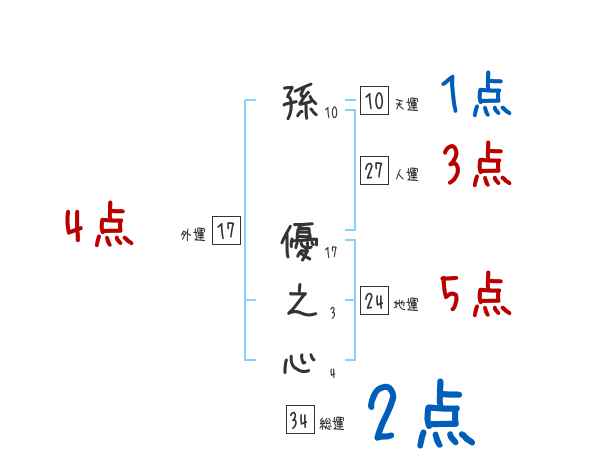 総運![]() | 孫優之心さんの総運は34画の2つ星!独創性に優れるが、自尊心が強く災難に注意しましょう。 あなたの人生を表す1番重要な運勢です。生涯を通じて影響する総合運となり、主に50歳以降の晩年期に影響を及ぼします。 |