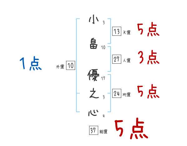 総運![]() | 小畠優之心さんの総運は37画の5つ星!努力家で順応性に優れる。現実的な考え方ができ忠実に物事をこなす。 あなたの人生を表す1番重要な運勢です。生涯を通じて影響する総合運となり、主に50歳以降の晩年期に影響を及ぼします。 |