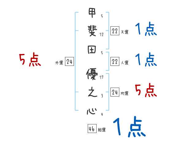 外運![]() | 甲斐田優之心さんの外運は24画の5つ星!家庭運が良く順調な人生。金運にも恵まれる。 生活面を象徴する運勢です。外部から受ける影響力を表し、結婚運、家庭運や職場、環境への順応性を表します。 |