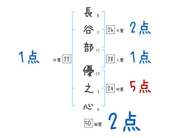 天運![]() | 長谷部優之心さんの天運は26画の2つ星!波瀾万丈かも。信頼できる人を大事にしましょう。 家系が持つ宿命的な運勢を表します。祖先から受け継いだ苗字ですので自分の力が及びません。家柄を象徴します。 |