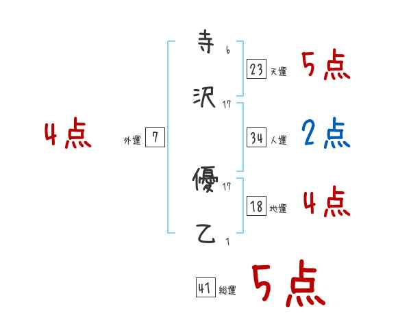 外運![]() | 寺沢優乙さんの外運は7画の4つ星!強い意志や信念を持ち独立心が強い。自立する。 生活面を象徴する運勢です。外部から受ける影響力を表し、結婚運、家庭運や職場、環境への順応性を表します。 |