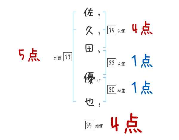 総運![]() | 佐久田優也さんの総運は35画の4つ星!温厚な性格で感受性が高い。穏和な性格で人望が厚い。 あなたの人生を表す1番重要な運勢です。生涯を通じて影響する総合運となり、主に50歳以降の晩年期に影響を及ぼします。 |