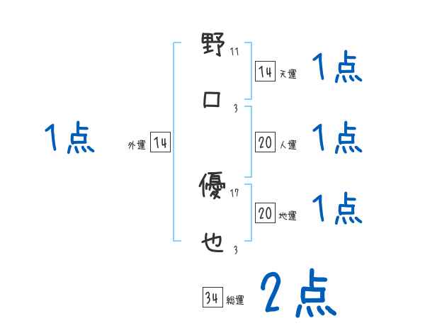 外運![]() | 野口優也さんの外運は14画の1つ星!人に対して優しいがストレスを溜め込みがち。人間関係のトラブルを避けるよう気をつけましょう。 生活面を象徴する運勢です。外部から受ける影響力を表し、結婚運、家庭運や職場、環境への順応性を表します。 |