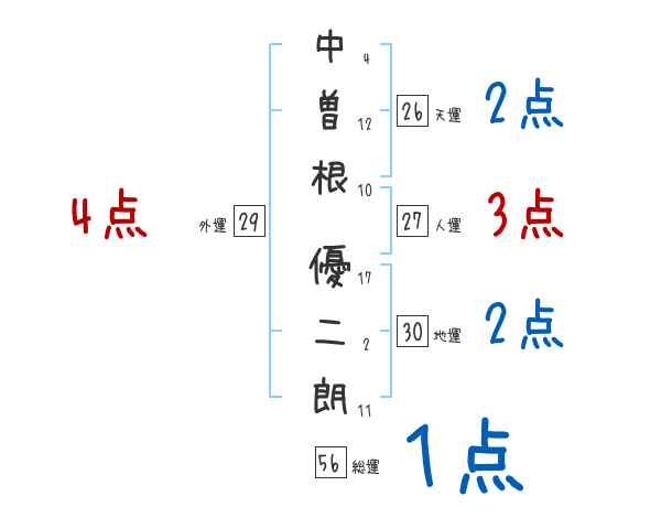 総運![]() | 中曽根優二朗さんの総運は56画の1つ星!消極的で無気力になりがち。誠実な気持ちが必要でしょう。 あなたの人生を表す1番重要な運勢です。生涯を通じて影響する総合運となり、主に50歳以降の晩年期に影響を及ぼします。 |