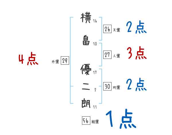 外運![]() | 横畠優二朗さんの外運は29画の4つ星!完全主義で才能がある。厳格な心の持ち主。 生活面を象徴する運勢です。外部から受ける影響力を表し、結婚運、家庭運や職場、環境への順応性を表します。 |