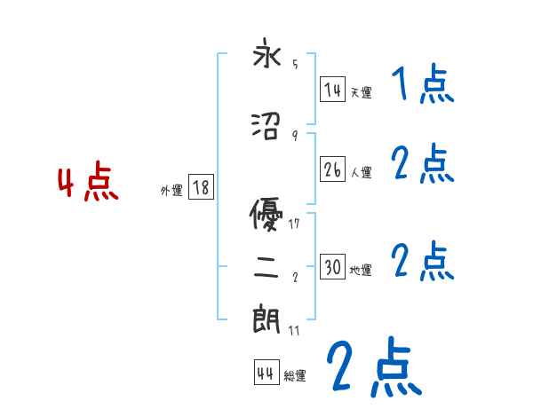 総運![]() | 永沼優二朗さんの総運は44画の2つ星!誠実で慎重な性格。物事を考えすぎないように注意しましょう。 あなたの人生を表す1番重要な運勢です。生涯を通じて影響する総合運となり、主に50歳以降の晩年期に影響を及ぼします。 |