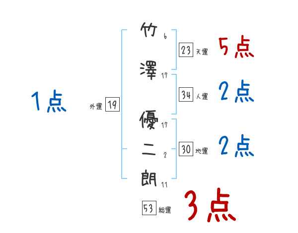 天運![]() | 竹澤優二朗さんの天運は23画の5つ星!想像力に優れ活力がある。一代で成功し名誉を手に入れる。 家系が持つ宿命的な運勢を表します。祖先から受け継いだ苗字ですので自分の力が及びません。家柄を象徴します。 |