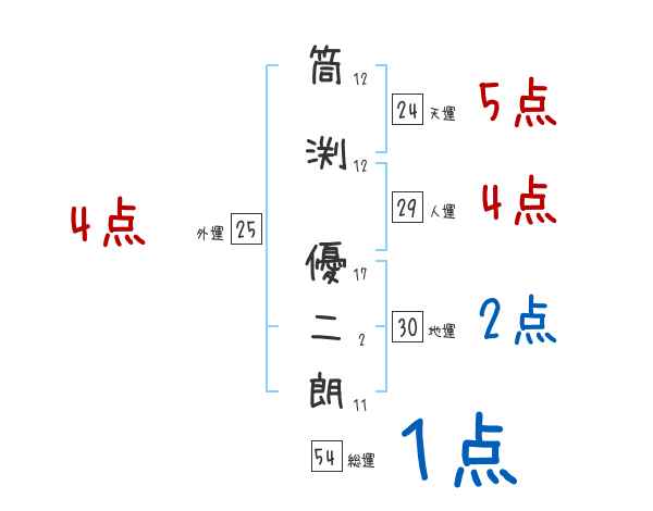 天運![]() | 筒渕優二朗さんの天運は24画の5つ星!家庭運が良く順調な人生。金運にも恵まれる。 家系が持つ宿命的な運勢を表します。祖先から受け継いだ苗字ですので自分の力が及びません。家柄を象徴します。 |