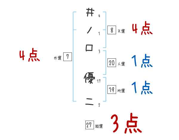 外運![]() | 井ノ口優二さんの外運は7画の4つ星!強い意志や信念を持ち独立心が強い。自立する。 生活面を象徴する運勢です。外部から受ける影響力を表し、結婚運、家庭運や職場、環境への順応性を表します。 |
