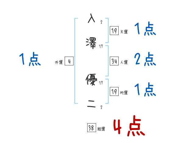 天運![]() | 入澤優二さんの天運は19画の1つ星!優れた才能を持ちますが、協調性が足りないことも。周りの人と協力する事を意識しましょう。 家系が持つ宿命的な運勢を表します。祖先から受け継いだ苗字ですので自分の力が及びません。家柄を象徴します。 |