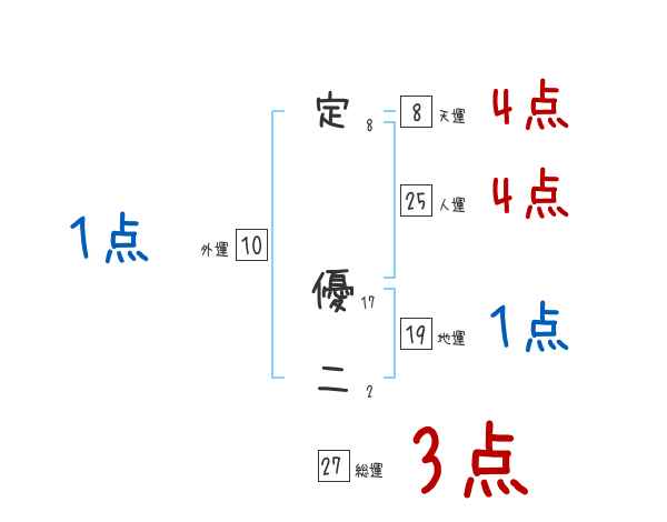 外運![]() | 定優二さんの外運は10画の1つ星!不安を感じやすい傾向。ストレスを抱えないように注意しましょう。 生活面を象徴する運勢です。外部から受ける影響力を表し、結婚運、家庭運や職場、環境への順応性を表します。 |