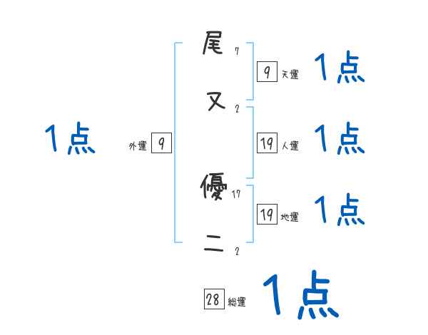 総運![]() | 尾又優二さんの総運は28画の1つ星!家庭環境に注意。スポーツで活躍できる能力があるかも。 あなたの人生を表す1番重要な運勢です。生涯を通じて影響する総合運となり、主に50歳以降の晩年期に影響を及ぼします。 |
