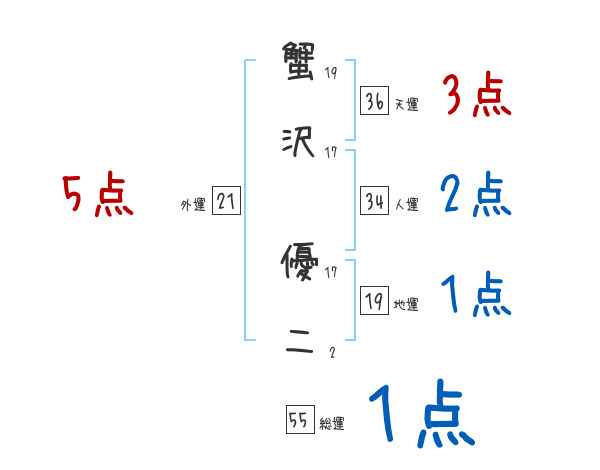 外運![]() | 蟹沢優二さんの外運は21画の5つ星!統率力がある。独立し成功する。名誉を手に入れる。 生活面を象徴する運勢です。外部から受ける影響力を表し、結婚運、家庭運や職場、環境への順応性を表します。 |