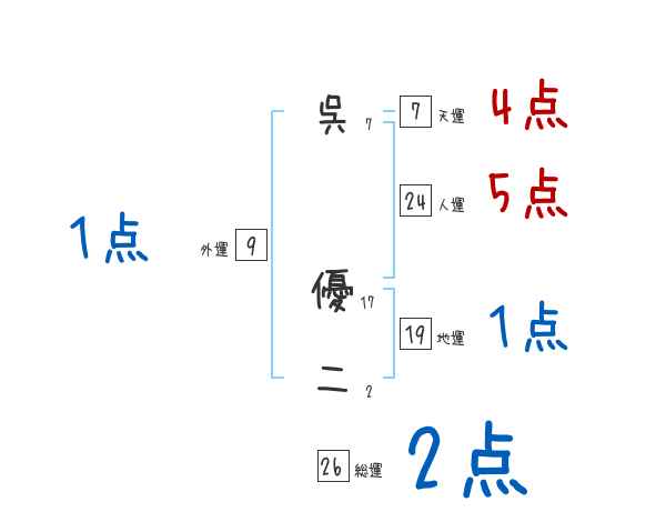 外運![]() | 呉優二さんの外運は9画の1つ星!消極的で才能を発揮することが苦手なことも。周りの意見に耳を傾けましょう。 生活面を象徴する運勢です。外部から受ける影響力を表し、結婚運、家庭運や職場、環境への順応性を表します。 |