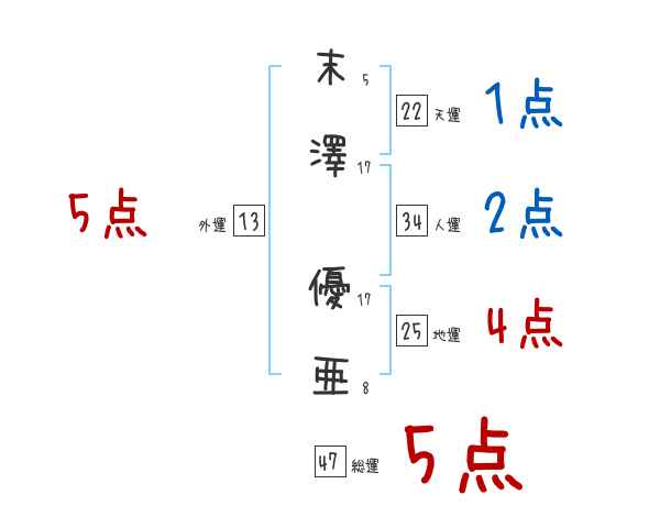 総運![]() | 末澤優亜さんの総運は47画の5つ星!実力が開花し発展する円満な人生。財に恵まれる。 あなたの人生を表す1番重要な運勢です。生涯を通じて影響する総合運となり、主に50歳以降の晩年期に影響を及ぼします。 |