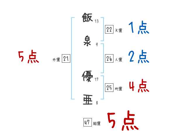 総運![]() | 飯泉優亜さんの総運は47画の5つ星!実力が開花し発展する円満な人生。財に恵まれる。 あなたの人生を表す1番重要な運勢です。生涯を通じて影響する総合運となり、主に50歳以降の晩年期に影響を及ぼします。 |