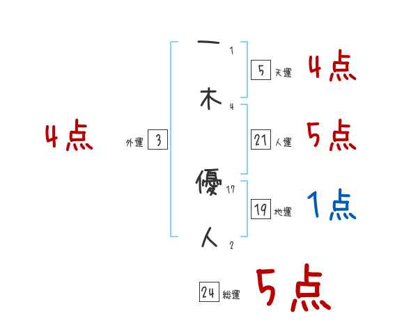 天運![]() | 一木優人さんの天運は5画の4つ星!健康で安泰。協調性に優れ、財産に恵まれる。 家系が持つ宿命的な運勢を表します。祖先から受け継いだ苗字ですので自分の力が及びません。家柄を象徴します。 |