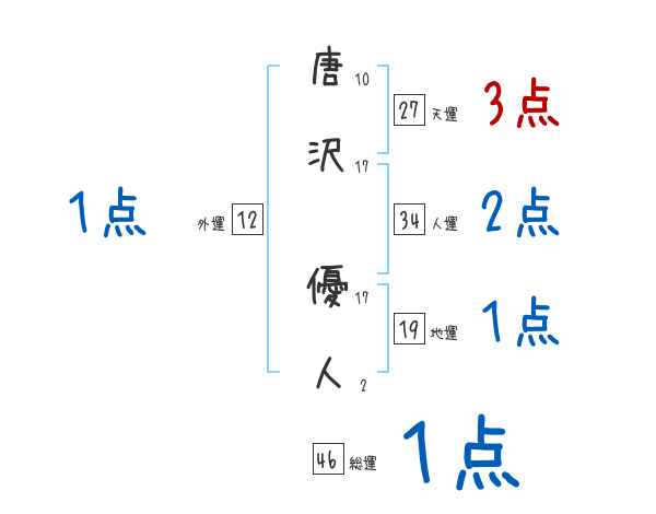 総運![]() | 唐沢優人さんの総運は46画の1つ星!迷走することが多く苦労するかも。目先のことにとらわれないように。 あなたの人生を表す1番重要な運勢です。生涯を通じて影響する総合運となり、主に50歳以降の晩年期に影響を及ぼします。 |