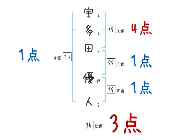 総運![]() | 宇多田優人さんの総運は36画の3つ星!先見性が豊かです。多少神経質で苦労することも。 あなたの人生を表す1番重要な運勢です。生涯を通じて影響する総合運となり、主に50歳以降の晩年期に影響を及ぼします。 |