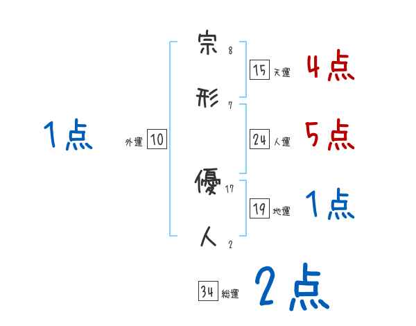 総運![]() | 宗形優人さんの総運は34画の2つ星!独創性に優れるが、自尊心が強く災難に注意しましょう。 あなたの人生を表す1番重要な運勢です。生涯を通じて影響する総合運となり、主に50歳以降の晩年期に影響を及ぼします。 |