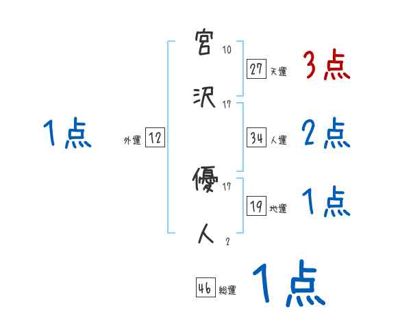 天運![]() | 宮沢優人さんの天運は27画の3つ星!頭脳明晰だが強情で摩擦が多い傾向。孤立に注意。 家系が持つ宿命的な運勢を表します。祖先から受け継いだ苗字ですので自分の力が及びません。家柄を象徴します。 |