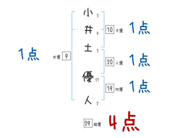 外運![]() | 小井土優人さんの外運は9画の1つ星!消極的で才能を発揮することが苦手なことも。周りの意見に耳を傾けましょう。 生活面を象徴する運勢です。外部から受ける影響力を表し、結婚運、家庭運や職場、環境への順応性を表します。 |