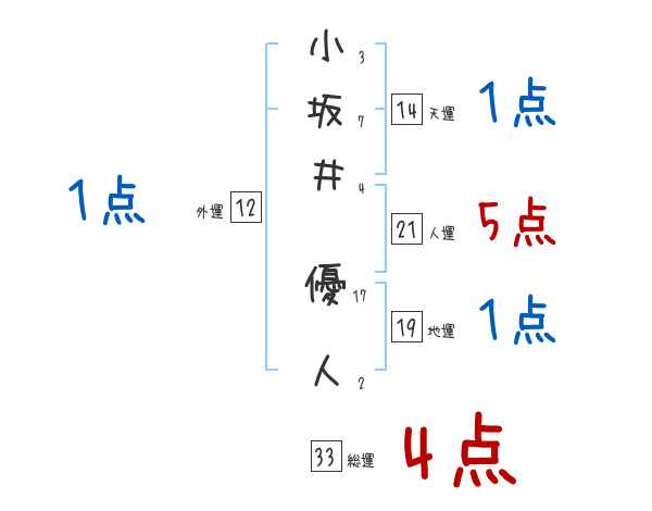 天運![]() | 小坂井優人さんの天運は14画の1つ星!人に対して優しいがストレスを溜め込みがち。人間関係のトラブルを避けるよう気をつけましょう。 家系が持つ宿命的な運勢を表します。祖先から受け継いだ苗字ですので自分の力が及びません。家柄を象徴します。 |