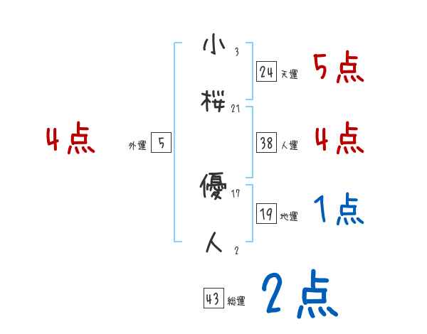 総運![]() | 小桜優人さんの総運は43画の2つ星!頑固な性格で独立心が強いかも。やや非現実的で浪費に注意しましょう。 あなたの人生を表す1番重要な運勢です。生涯を通じて影響する総合運となり、主に50歳以降の晩年期に影響を及ぼします。 |