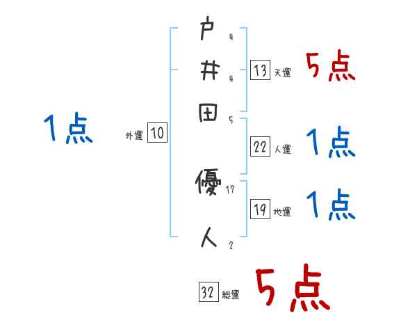 総運![]() | 戸井田優人さんの総運は32画の5つ星!柔軟性があり成功する。チャンスが多く金運が良い。 あなたの人生を表す1番重要な運勢です。生涯を通じて影響する総合運となり、主に50歳以降の晩年期に影響を及ぼします。 |