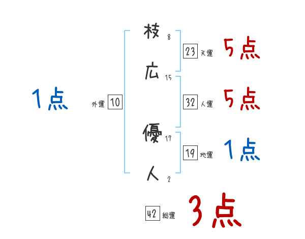 人運![]() | 枝広優人さんの人運は32画の5つ星!柔軟性があり成功する。チャンスが多く金運が良い。 性格や才能などを表す2番目に重要な運勢です。人間関係や協調性、社会的な成功に影響します。主に20歳から50歳ぐらいまでの中年期の運勢を表します。 |