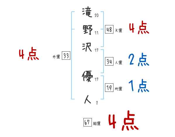 外運![]() | 滝野沢優人さんの外運は33画の4つ星!権力志向でプライドが高い。勇気があり運を切り開き成功する。 生活面を象徴する運勢です。外部から受ける影響力を表し、結婚運、家庭運や職場、環境への順応性を表します。 |