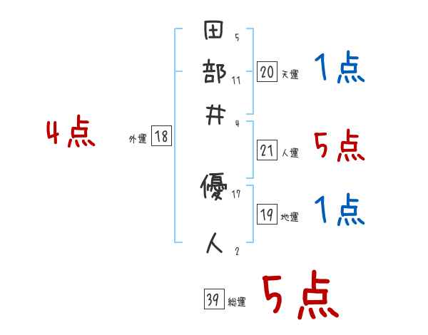外運![]() | 田部井優人さんの外運は18画の4つ星!情熱的で剛気。忍耐力があり信頼される。 生活面を象徴する運勢です。外部から受ける影響力を表し、結婚運、家庭運や職場、環境への順応性を表します。 |