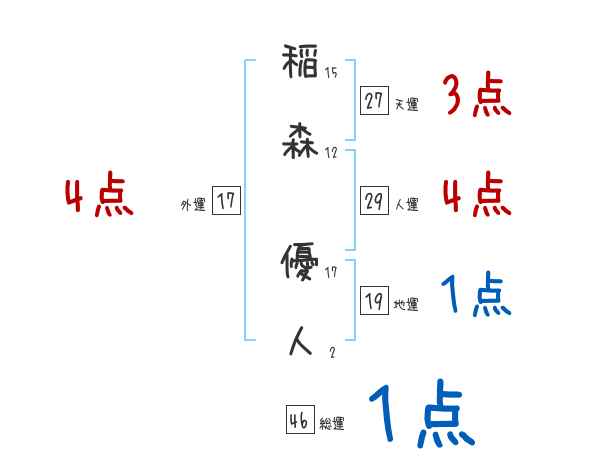 外運![]() | 稲森優人さんの外運は17画の4つ星!積極的な行動力。地位を気づき財産を手に入れる。純粋な心と直感力。 生活面を象徴する運勢です。外部から受ける影響力を表し、結婚運、家庭運や職場、環境への順応性を表します。 |
