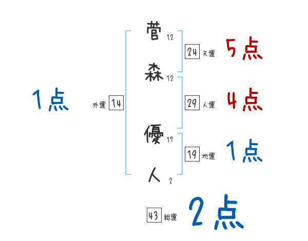 外運![]() | 菅森優人さんの外運は14画の1つ星!人に対して優しいがストレスを溜め込みがち。人間関係のトラブルを避けるよう気をつけましょう。 生活面を象徴する運勢です。外部から受ける影響力を表し、結婚運、家庭運や職場、環境への順応性を表します。 |