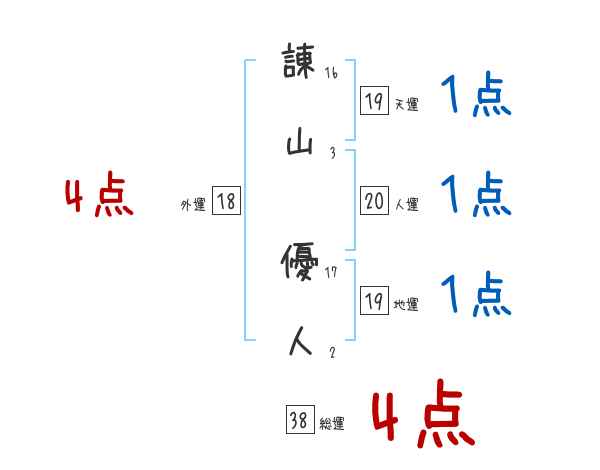 天運![]() | 諌山優人さんの天運は19画の1つ星!優れた才能を持ちますが、協調性が足りないことも。周りの人と協力する事を意識しましょう。 家系が持つ宿命的な運勢を表します。祖先から受け継いだ苗字ですので自分の力が及びません。家柄を象徴します。 |