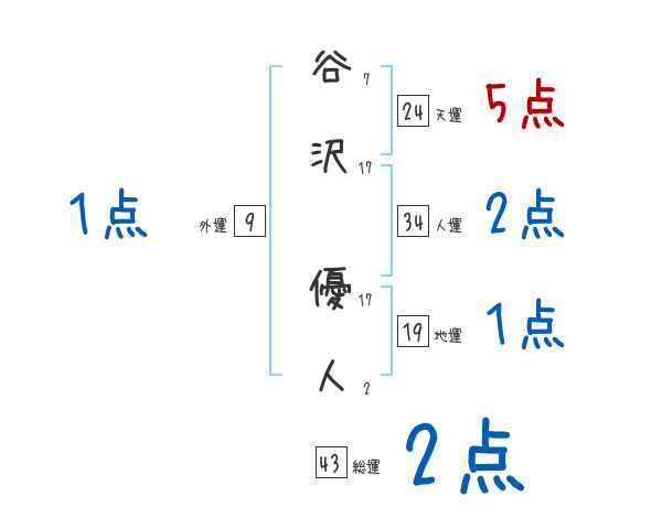天運![]() | 谷沢優人さんの天運は24画の5つ星!家庭運が良く順調な人生。金運にも恵まれる。 家系が持つ宿命的な運勢を表します。祖先から受け継いだ苗字ですので自分の力が及びません。家柄を象徴します。 |