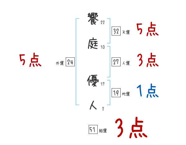 天運![]() | 饗庭優人さんの天運は32画の5つ星!柔軟性があり成功する。チャンスが多く金運が良い。 家系が持つ宿命的な運勢を表します。祖先から受け継いだ苗字ですので自分の力が及びません。家柄を象徴します。 |