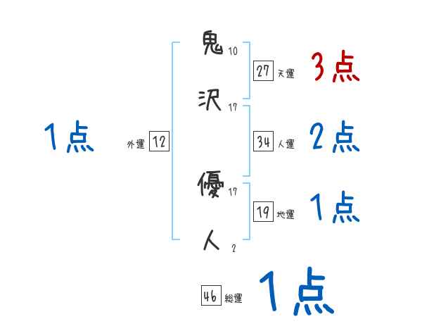 総運![]() | 鬼沢優人さんの総運は46画の1つ星!迷走することが多く苦労するかも。目先のことにとらわれないように。 あなたの人生を表す1番重要な運勢です。生涯を通じて影響する総合運となり、主に50歳以降の晩年期に影響を及ぼします。 |