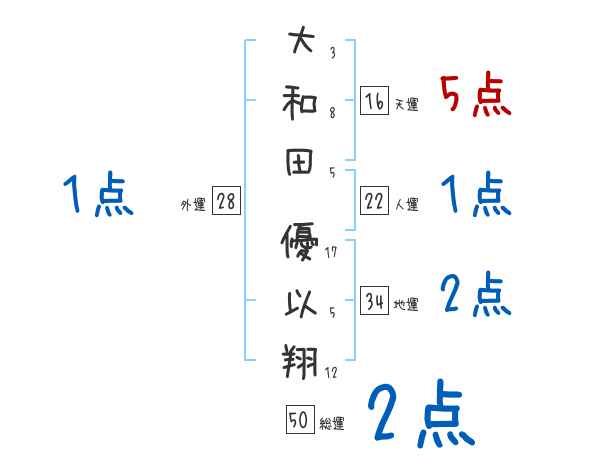 天運![]() | 大和田優以翔さんの天運は16画の5つ星!人望が厚く大きく発展する。逆転成功が見える。 家系が持つ宿命的な運勢を表します。祖先から受け継いだ苗字ですので自分の力が及びません。家柄を象徴します。 |