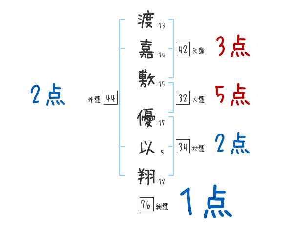 人運![]() | 渡嘉敷優以翔さんの人運は32画の5つ星!柔軟性があり成功する。チャンスが多く金運が良い。 性格や才能などを表す2番目に重要な運勢です。人間関係や協調性、社会的な成功に影響します。主に20歳から50歳ぐらいまでの中年期の運勢を表します。 |