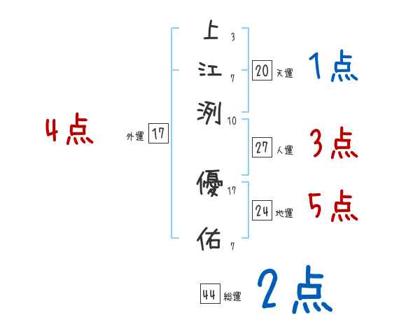 外運![]() | 上江洌優佑さんの外運は17画の4つ星!積極的な行動力。地位を気づき財産を手に入れる。純粋な心と直感力。 生活面を象徴する運勢です。外部から受ける影響力を表し、結婚運、家庭運や職場、環境への順応性を表します。 |